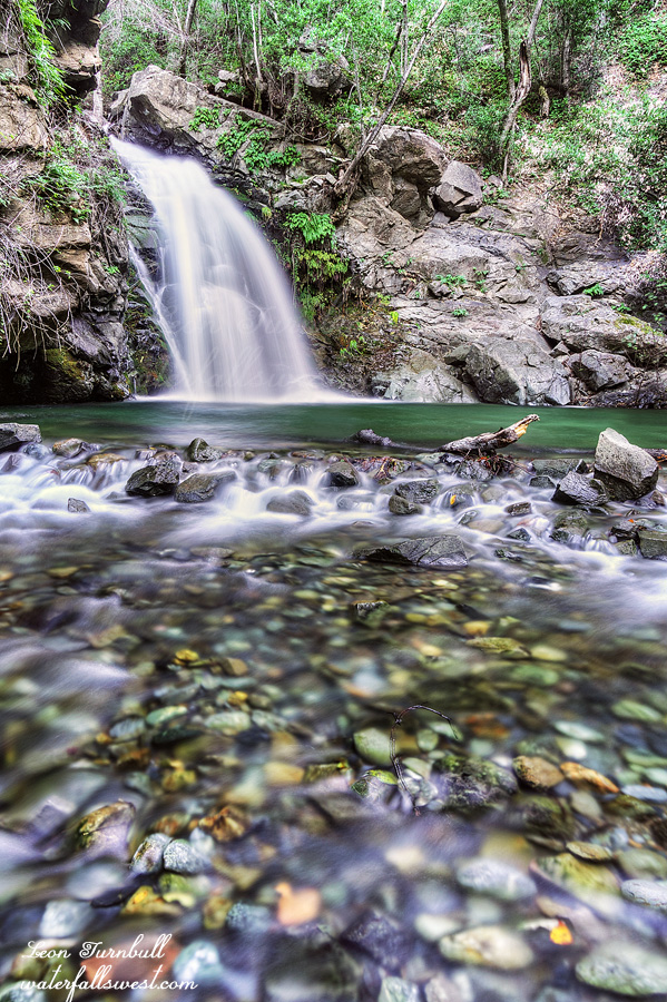 There is no trail to Vicente Falls. It is about a half mile upstream and you just walk straight up the creek and along the side of the creek (in the poison oak). It is not too difficult and it is fun. Except for a couple parts where (yet again) there were some big tree blowdowns in the canyon from the Dolan Fire. This made the hike almost impassable but not quite. I was able to continue past them and made it up to the waterfall.