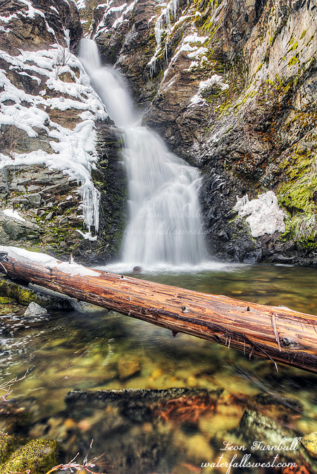 On my way back from Moyie Falls, I called my wife back at the ranch to see if she or anyone else wanted to go with me quickly to Marysville Falls. My sister lives only a few minutes away from this 45 ft. high cascade in the middle of the town of Marysville. It is a short and easy walk to get to it. But we had to move very quickly. I could tell the sun was on the verge of coming out from hiding. The race was on. Could I get there in time? Doo doo doo doo.