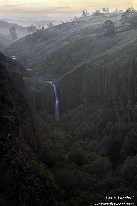 This past weekend I went back to Table Mountain in Oroville once more, this time to visit Beatson Falls. My goal was to be there at sunrise, and that meant I had to start hiking in the dark. It is interesting hiking cross country on Table Mountain in the dark. There are no trails to follow. The major concern is avoiding the cow dung, easy enough to do in the daylight (if you are paying attention), but definitely a challenge to do in the dark. With my headlamp though, I think I managed to avoid all the large brown obstacles. I was hoping I would not run into any groups of killer cows in the dark but that was not to be. I came across a couple such groups, but fortunately they scattered as I approached. The one other concern in the dark is getting lost. It is hard enough to find your way in the daylight. But with my GPS in hand, I did not really have any problems. The one big problem on the way to Beatson Falls is a ravine that you need to cross. It was a bit tricky in the dark, but I managed.