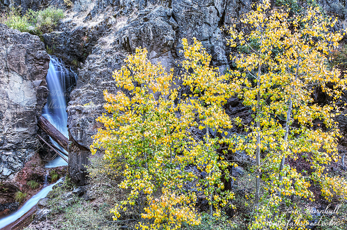 This is Ritter Lakes Falls, total height is about 350 ft. high. The bottom section shown here is about 200 ft., the top is out of view. I could not find a viewpoint where I could see the whole thing in one shot, though it may exist somewhere. I got down to the bottom of it here a bit past sunrise and there was still some nice color in the sky. Pretty sweet. I was surprised that this creek still had so much flow in it. On the way up, I had to wade across it at a sketchy spot above a small waterfall. It was a bit tricky. On the way back down, though, I found a much easier place where I could just jump across.