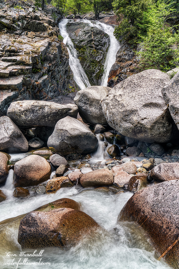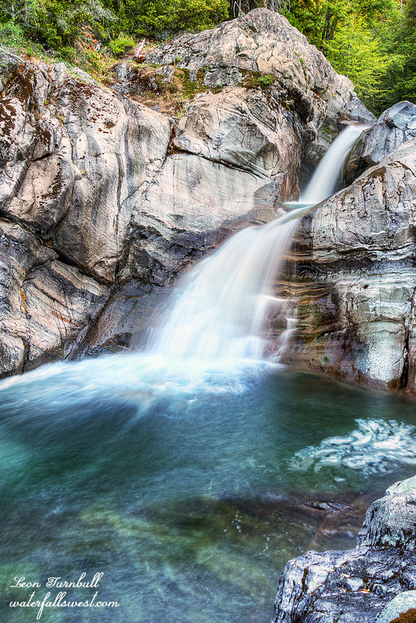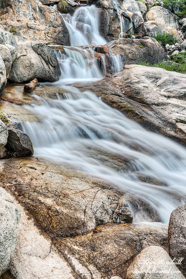 Setting up my tent at Waterfall Camp proper proved to be impossible. The wind was intense. There are some tent pads, but they are on rock, so I could not get my tent stakes into the ground. If it was not windy, it would have been perfect with stunning views of the waterfalls and Lake Aloha, but there was no way to get my tent secure here. There was another spot just down from the waterfalls that was in the trees and more sheltered. It was beside a mini waterfall and I could see the upper falls from this camp, but no views of the lake. No matter. I was able to get my tent set up securely. I ate my dinner, then afterwards went to photograph all five of the main waterfalls. All of them were spectacular. I took my time. I was in Heaven. I was in Rivendell. I was in the Desolation Wilderness.