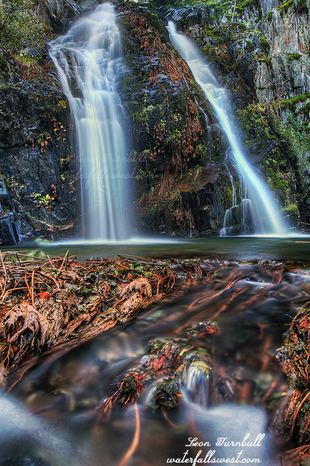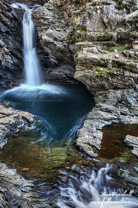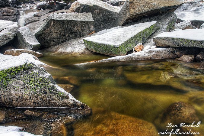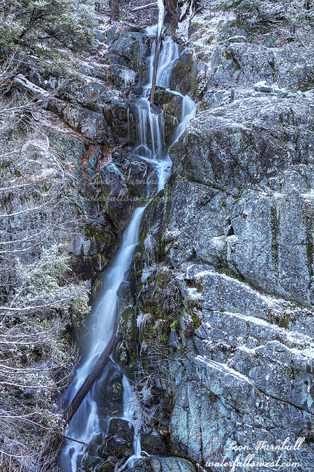 The first time I was here, the flow was far too strong to get across onto the big rock in the middle of the creek. This time the flow was much reduced, as expected, and I would have no trouble getting over to the rock. However, getting up on the rock was extremely treacherous. It was wet with snow on it, and slick as all out. I tried to get up multiple times, but I could not. There were no footholds, and I literally would have slid right off the rock into the middle of the creek. I tried to get some other angles, but could not find any. I tried to cross the creek, but it was too deep. I finally decided on this one and only possible view of the falls. Next time I come here, I have to make sure that not only is the creek flow reduced, but it is dry as well.