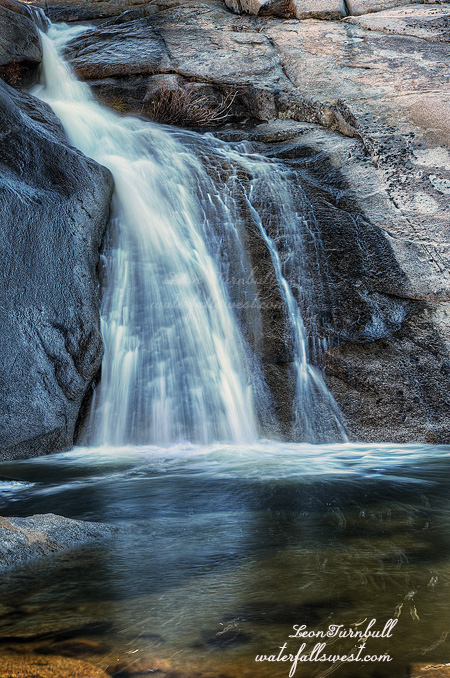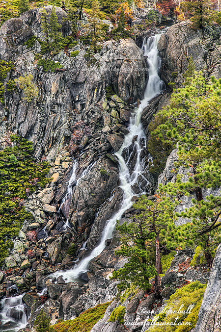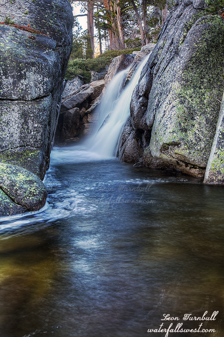 The Desolation Wilderness is a very special place. One of the best things about it that makes it so special is the wide open granite terrain that one can hike cross country on. No trails. Beautiful mountain scenery. The fast rushing creek flowing near by. It is spectacular. Please tell me you have done this in the Desolation Wilderness. Of course, you also have that deathly thick manzanita brush but that is a story for another day. I did not have any of that awful stuff in this area. It was beautiful and awesome, and I made good time up to Lower Gertrude Lake Falls, but I still did not make up any of that lost time, and I was 30 minutes late arriving at the falls. The sun was already shining onto the upper section of the falls and down into the canyon, however the lower section was still in shade, so I setup my tripod behind a big tree to block out the sun and took some photos. At least the light was much better than the last time I was here. The creek was also flowing fairly well. Normally, it would be pretty much dry at this time of year, but thanks to all that rain and now some snow melting, voila, we have waterfall.
