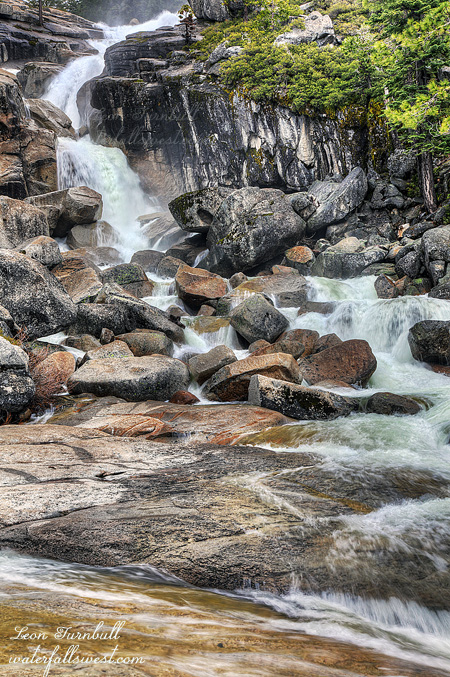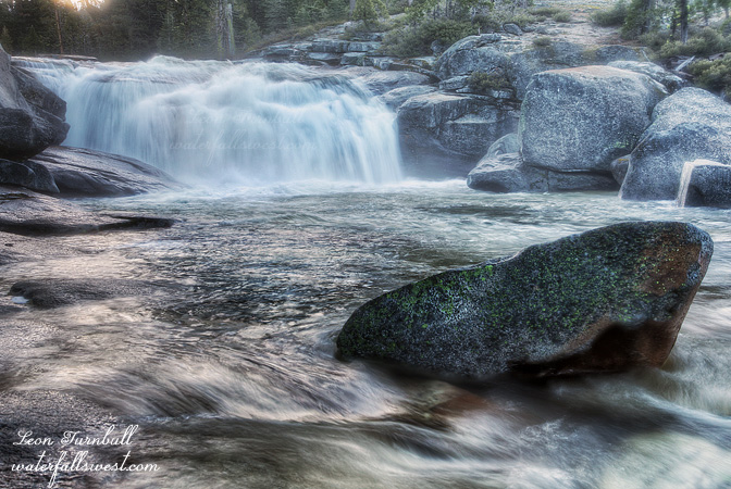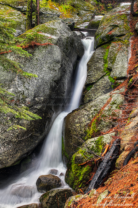 Anyhow, around 4pm, I went over to the top of the falls to get some water to make my dinner, had a wonderful baked lasagna meal (well – freeze dried – is that wonderful?), and set off with my daypack back down to Tiltill Creek. Huh? Well there is a nice 40 ft. falls at the bridge over Tiltill Creek you know, and of course I wanted to get a good photo of it in good light. What I did not realize is that it is quite a walk from Tiltill Creek to Rancheria, and a big ascent. For some reason, I thought it would be much easier to get back and forth between the two. I had planned to shoot Tiltill, then the three waterfalls on Rancheria all on that same evening. But they are all much further apart then I thought. Tiltill Creek is not very easy to photograph. In fact, it is impossible to get a clear view of it. That seems to be the norm with all these waterfalls (except Lower Rancheria – pictured here). After Tiltill, I went cross country over to Rancheria Creek. I hiked up the mountain off-trail to get back to Lower Rancheria Falls. It was actually quite fun. Way over back on the trail, I noticed a large (noisy) group coming in to Rancheria for the night, the only other group that came this day to Rancheria. They went right to the spot I had initially chosen to camp (with the mosquitoes). I’m sure glad I did not setup camp there. I took many photos of Lower Rancheria. It is a fascinating waterfall with a 40 ft. drop then fanning out in an amazingly wide 60 ft. slide. I think it would make for an amazing water slide, and you might actually survive it, as long as you are certain you can get out of the water at the bottom of it, before you get to the big waterfalls below it (episode 3.5 spoiler alert). I’m not certain you actually could get out with the way Rancheria Creek was raging this day. When I got back to my campsite at the top of the falls, I went back over to the creek to my water spot, and I found it was completely flooded. The creek had risen this much in just a few hours. The next morning, it was flooded even more. I knew it would rise during the day with the warm weather, and I could not tell how much it had risen exactly, but it seemed a lot more than I would have thought, and it had me a bit concerned. But more on this in Episode 4. I fell asleep listening to the soothing roar of the creek.