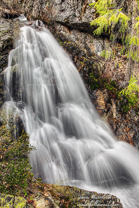 I arrived down at the bottom of the canyon a little after 5PM. I was expecting a waterfall twice as big, but I found just a small 26 ft. high falls. That is a heckuva long hike for such a small waterfall. Up to this point the hike was fairly easy, but the last section down to the creek was very cliffy and very brushy. I could not find a way down to the bottom. I searched around frantically, I had no time to waste now, and finally found a view of the upper most portion of the falls (20 ft.), from a rock which had steep dropoffs all around, but I got out to it carefully, setup my tripod, took my photos, then got the heck out of there.