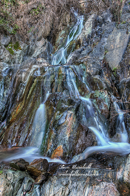 I climbed back up to the Ditch and started hiking east. It was overgrown with brush, but it was manageable. The late Russell Towle had mentioned an impassable Big Brush along here somewhere, but I never saw this. I’m not sure where he was thinking this was, but I never encountered anything that was remotely impassable. I did encounter another cliffy section, which required me to descend off trail to the bottom of the cliff, across unstable rocks, then back up to the Ditch. And continue along the Ditch. The Ditch ends at the creek. Actually it ends slightly before the creek. It looked a bit sketchy to continue from there, so I descended downhill until I could get a look at the waterfall. It was not a waterfall. I was really hoping this was a straight plunge off the cliffs, but instead it was just a series of small cascades on an unnamed creek that was not flowing very well. Certainly not worthy of mention on waterfallswest.com. But I could not see the top of it, it was hidden behind the rocks above me. I climbed back up the hill to the trail, then examined the sketchy traverse. One step was going to be a doozy, but I thought I could manage it. I came all this way, I had to at least see what the top part of this creek looked like. Hold breath. Take step. Made it across. Now I was able to make it down to the creekside easily. I still could not see behind those rocks. I crossed the creek. Looked up. Voila. Amazing waterfall found! It was a straight drop off the cliffs after all, 93 ft. high, and very very pretty. It was still in shade also, thank the Lord. Photographing this beauty, however, was going to be a big problem. It is a very steep bank on the other side of the creek, and I had to scramble up this steep bank to get a good look at the falls. There was a ledge not far up, and I shot the falls from a distance here. After this, I wondered if I could get right up to the base of the falls. I decided to try. It was crazy. Straight up the side of the mountain, very steep, slipping and sliding, and scrambling on all fours. I finally made it up to the base of the cliff and walked along it over to the waterfall and was able to get down right at the base of the falls. It was beautiful, but it was not worth all that effort! I think also the angle was too severe to photograph, but I did take some shots, and I will be posting them here very soon. Alrighty then, time to go back down the mountain. One look from the top and I said “HOLY SHUBUMBA!!!” (or something like that). I am going to die! You don’t really realize how steep something is until you look down on it from above. I carefully and slowly made my way back down the mountain, crossed the creek, over the sketchy section, and finally had my feet planted firmly back on the Iowa Hill Ditch. Whew. Now I still had to hike back to Beacroft trailhead, and I was already completely spent. I only hiked 8 miles this day, but all the scrambling up and down mountain sides totally wiped me out, especially that last one up to the base of the waterfall. Well, I had to go back though if I wanted to avoid becoming bear food. I took my time on the hike back, taking it as easy as I could. Finally got back to the car, and was starving. I did not bring my lunch because I thought this was going to be a much quicker and easier hike. I managed to hold myself together until I got back to Foresthill where I stopped to refuel (my body). Then on the drive back from Foresthill to Auburn, in one second my great morning was practically ruined, when I saw a dead bear on the side of the road. Ugh! I hate seeing dead animals, but especially bears, which are my favorite animal. There are so few of them in California too, and this seems so pointless. The dufus that hit him was most likely speeding and it is an accident easily avoided (I don’t know that but it is probably true). Argh, argh argh! Anyway, other than that one last incident I did really have a great day in the American River Canyon.
