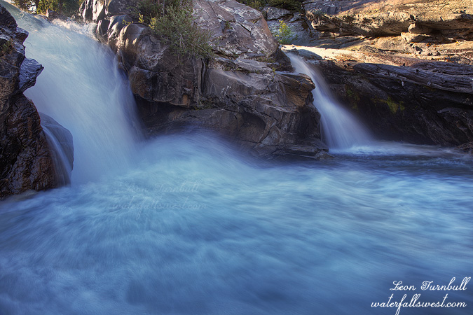 I arrived at Split Falls (the first of two small waterfalls on Fordyce Creek) a little bit after 8AM (which was about 30-45 minutes later than I wanted). The top of the falls was in the sun, but most of it was still in shade, so I made my way down to creekside and took some photos. This one did not really turn out too bad, and I was quite happy that I was able to get here before it was too late. The last time I was here, the creek was flowing at about 250 cfs, so at only 150 cfs today, I figured the flow would be substantially and noticeably lower. But instead Split Falls looked exactly the same as when I was here last time. Very strange, I thought. However, when I got up to the upper falls (Fordyce Falls), I could easily see there that the flow in the creek was a lot less than before. I did not shoot that one because it was in full sun.