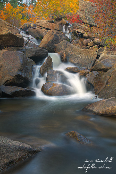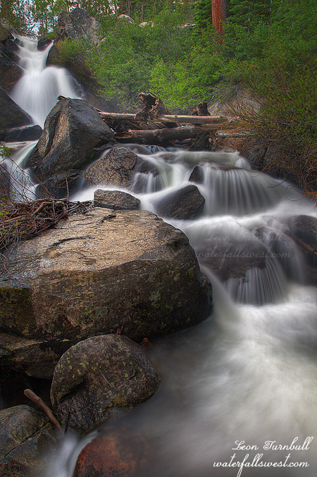 I ventured to the waterfall at the end of the lake, cascading down from towering 9983 ft. Pyramid Peak. It is a really really tall cascade, about 400 ft. high, but you cannot see the entire waterfall from any vantage point. It was also flowing on the poor side, and I was quite a bit disappointed actually, as I was expecting a lot more flow. I made it up to a spot where it drops most significantly, essentially a 100 ft. drop in two major tiers separated by a long slide. The upper section was in full sun, but the lower 23 ft. drop was in partial shade. I estimated the falls would be in the sun until about 6pm. I could not wait that long, or I would be hiking back in the dark down Horsetail Falls, not something I had any desire to do. I decided to shoot the lower falls in partial shade, then head back to the falls below Pyramid Lake, which I knew was already in shade.