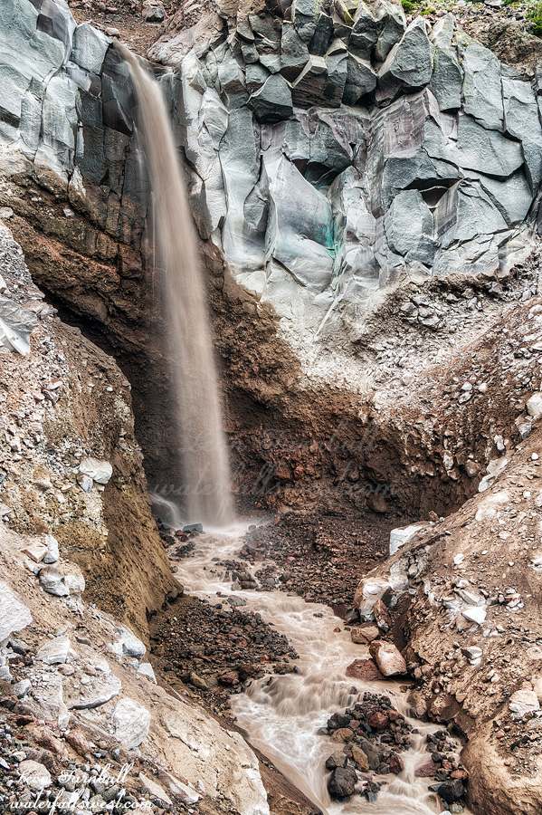 The nice thing is that it was a very cloudy day so I could get all my photos of the Bolam waterfalls early and have a relaxing evening and even sleep in. First up was Bolam Creek Falls, 92 ft. high. As you can see the water was very dirty. Chocolate sauce! Yummy! It was definitely very interesting and quite different from six years ago and I’m not just referring to the chocolate water. I think a lot of that was caused from rain up on the mountain. It was a lot dirtier than last time I was here so I think it was more than just glacial melt. In addition to this the waterfall seemed different. It was more of a straight down plunge. It was more graceful (even with the dirty water). One thing that was very different was the blue-green color in the rock beside the waterfall. That was not there six years ago. A large chunk of rock had broken off revealing that blue-green color underneath. My geologist brother-in-law thinks it is some sort of hydrothermal alteration and magmatic flow. Finally, I think there was more water flowing six years ago so that could mean there is not as much glacier melting now (or left). Bolam Creek Falls was certainly very fascinating to see this year.